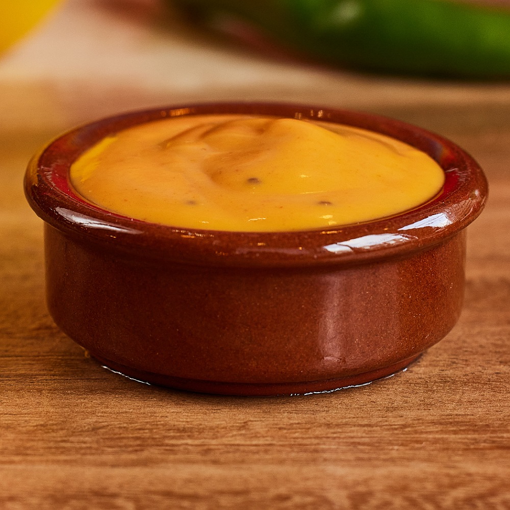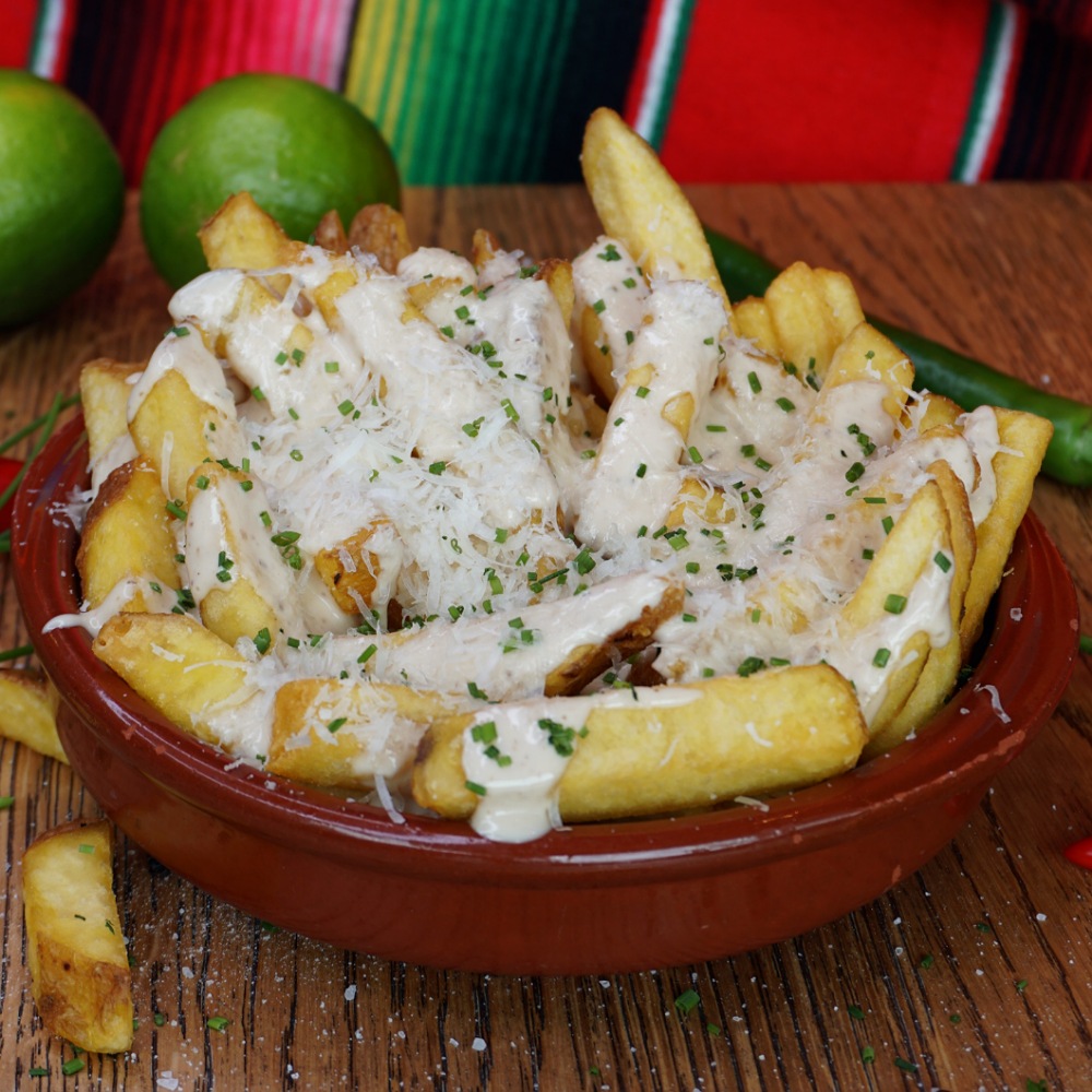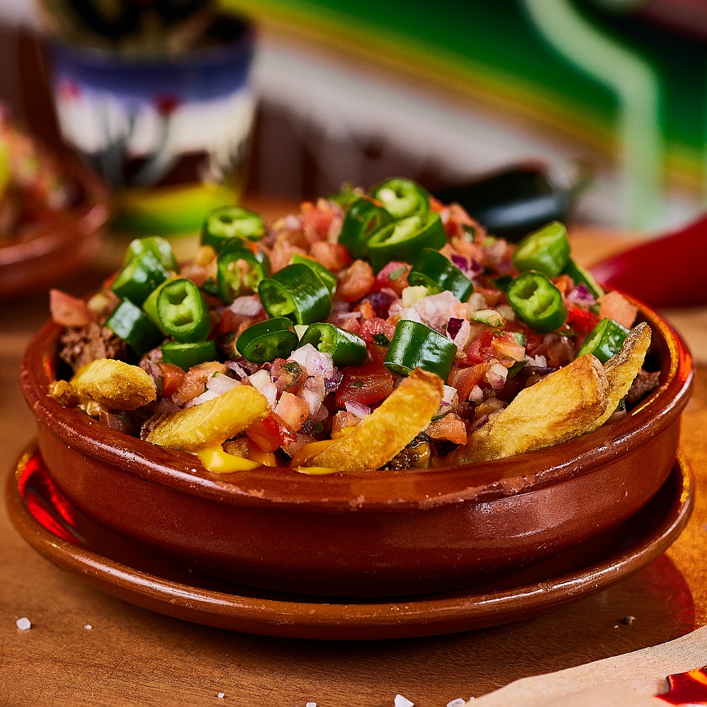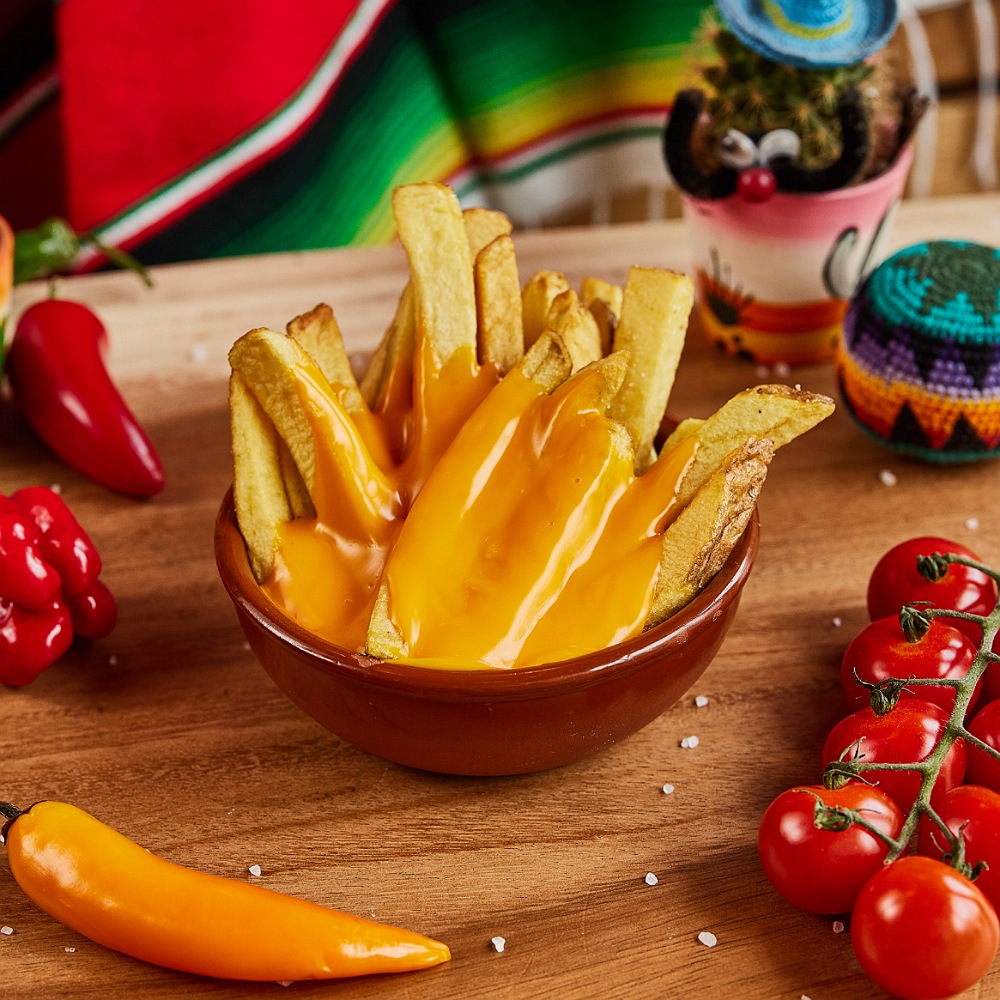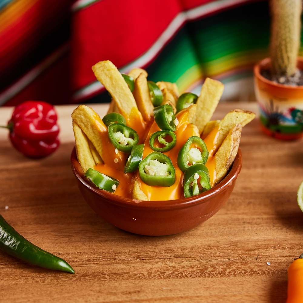 Huisgemaakte frites met schil, cheddar saus, pico de gallo en jalapeños met proteĂ¯ne naar keuze