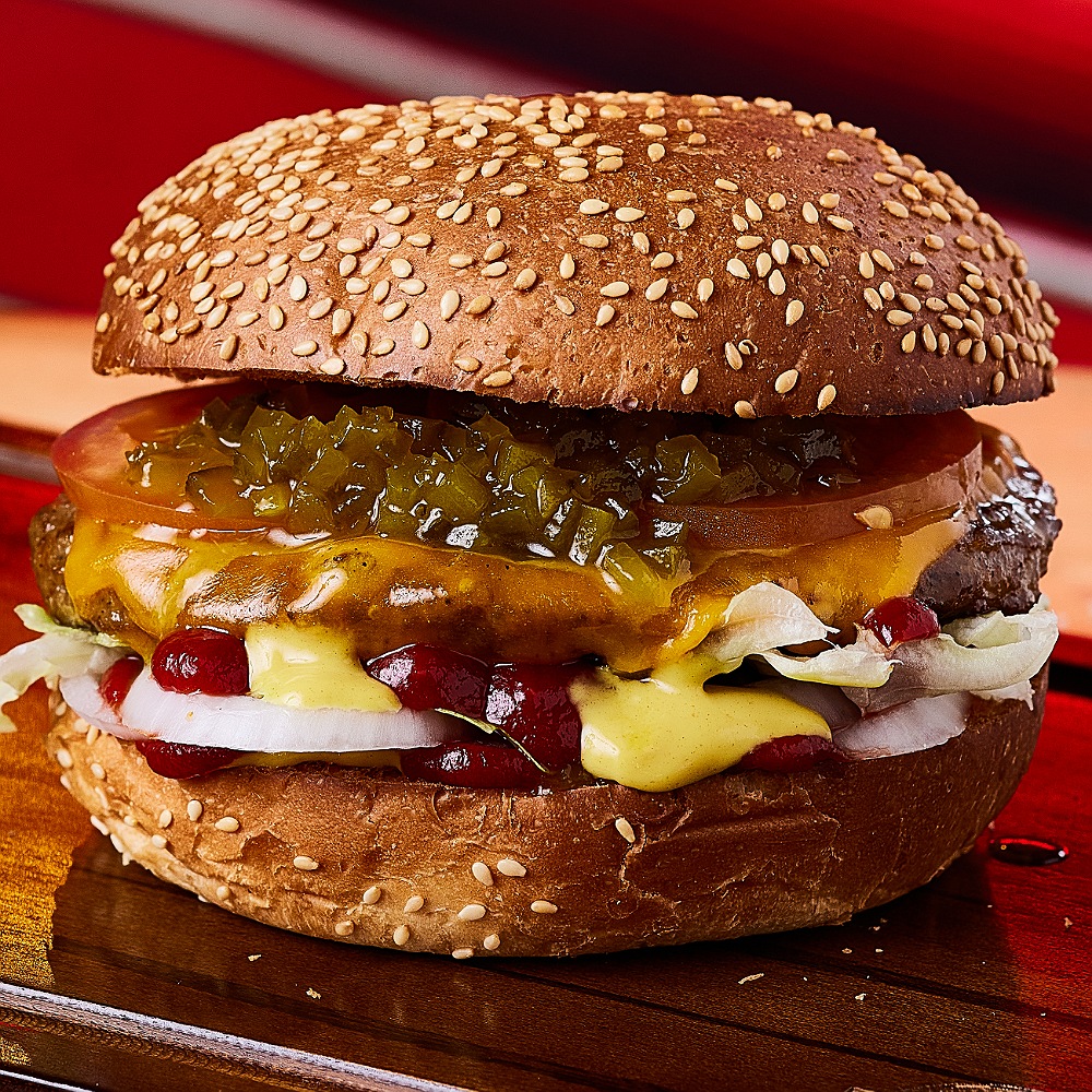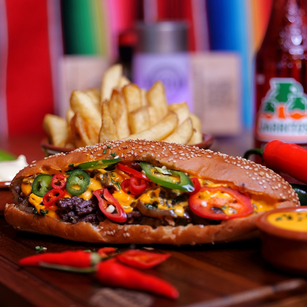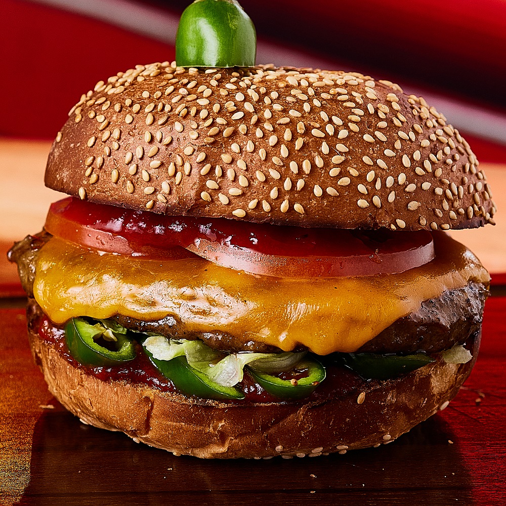 150 gram beefburger, Jordy's Bakery brioche, huisgemaakte chutney van jalapeño en tomaat, sla, jalapeños, Irish ...