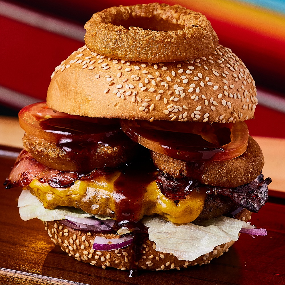 150 gram beefburger, Jordy's Bakery brioche, huisgemaakte BBQ saus, sla, rode ui, Ierse cheddar, kalfsbacon, ...
