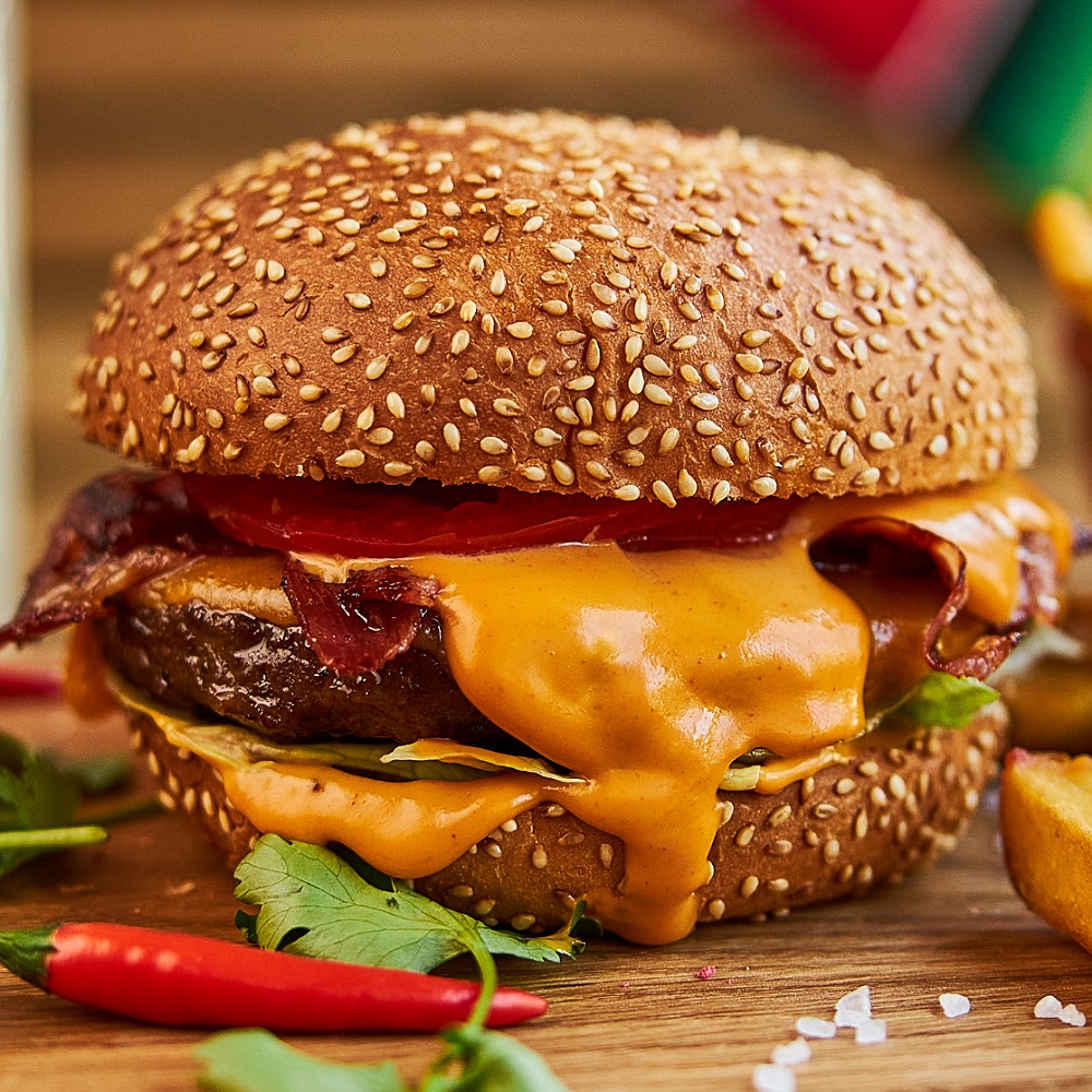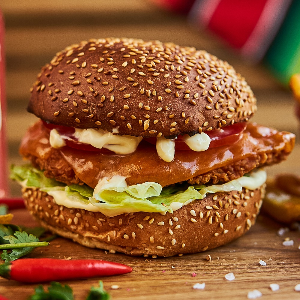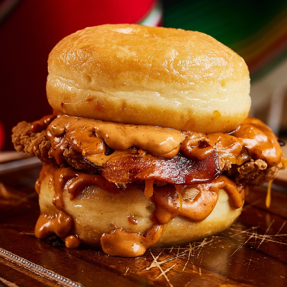 150 gram gefrituurde premium kipfiletburger op glazed donuts, chipotle mayonaise, Ierse cheddar en kalfsbacon