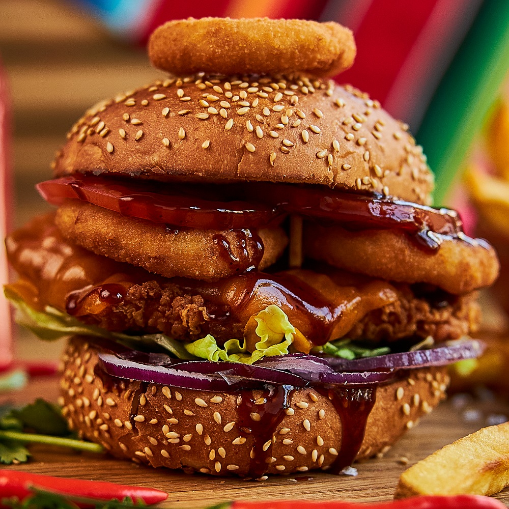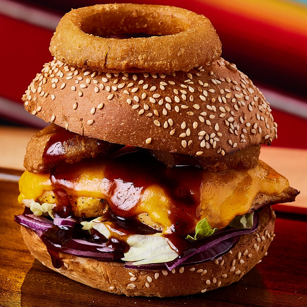 150 gram gegrilde kipfiletburger, Jordy's Bakery brioche, huisgemaakte BBQ saus, rode ui, Ierse cheddar, gefrituurde ...