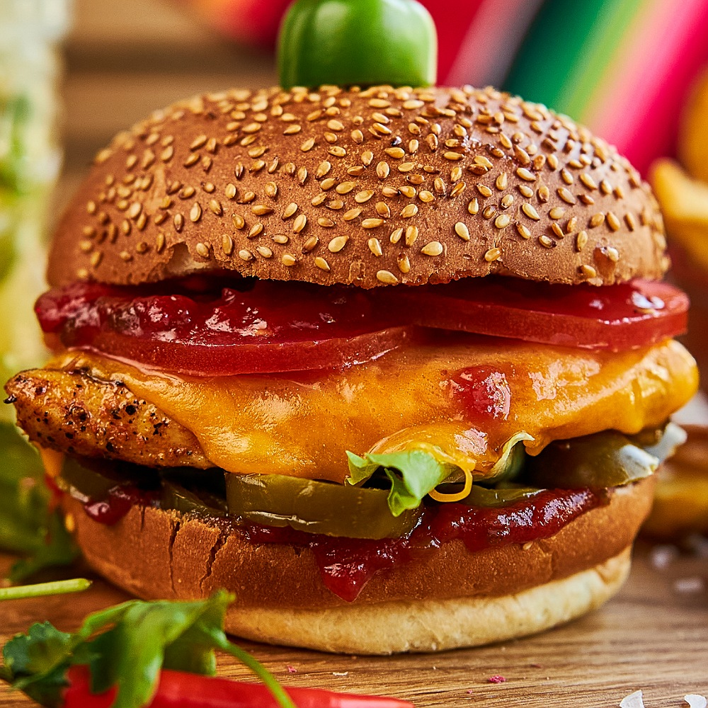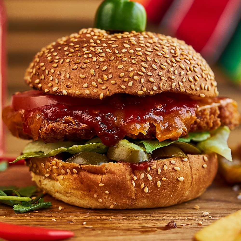 150 gram gefrituurde premium kipfiletburger, Jordy's Bakery brioche, huisgemaakte chutney gemaakt van jalapeño en tomaat, ...