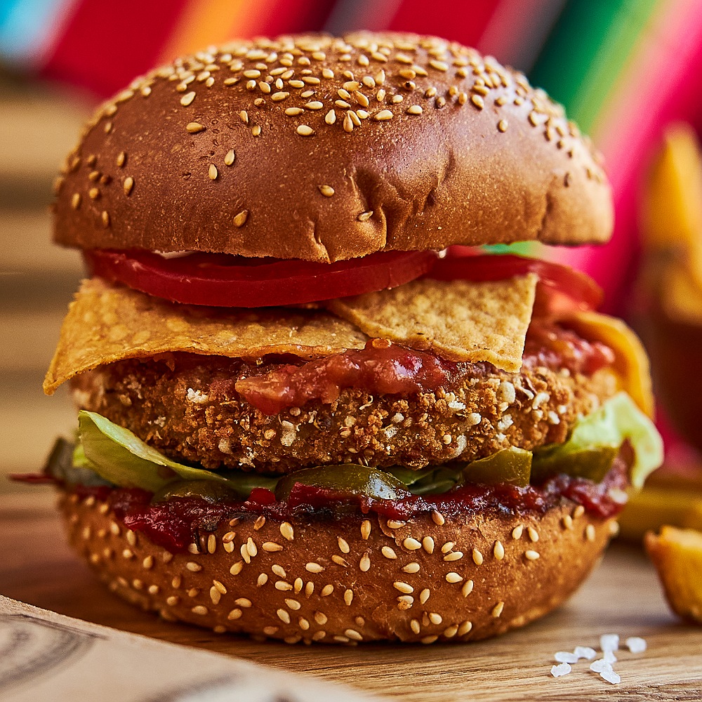 Gefrituurde vegan burger van avocado, maĂ¯s, quinoa en paneermeel, brioche bun, huisgemaakte chutney van jalapeños ...