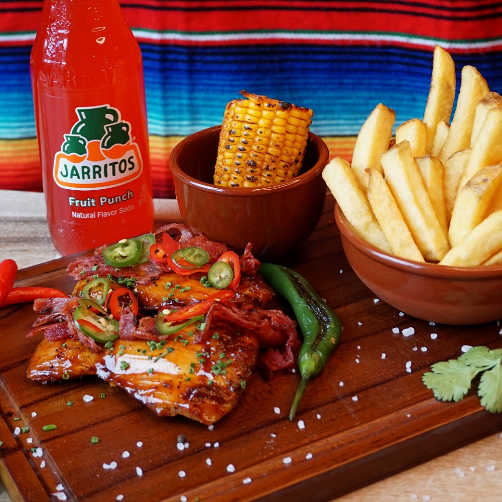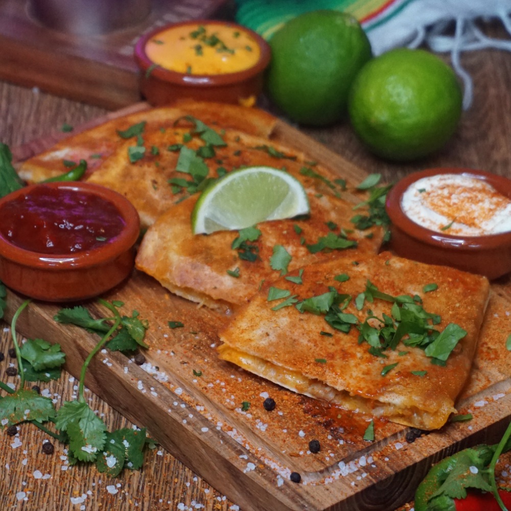 Gegrilde tarwetortilla's met vulling naar keuze, gesmolten kaas, limoen, Mexicaanse kruiden en koriander. Geserveerd met ...