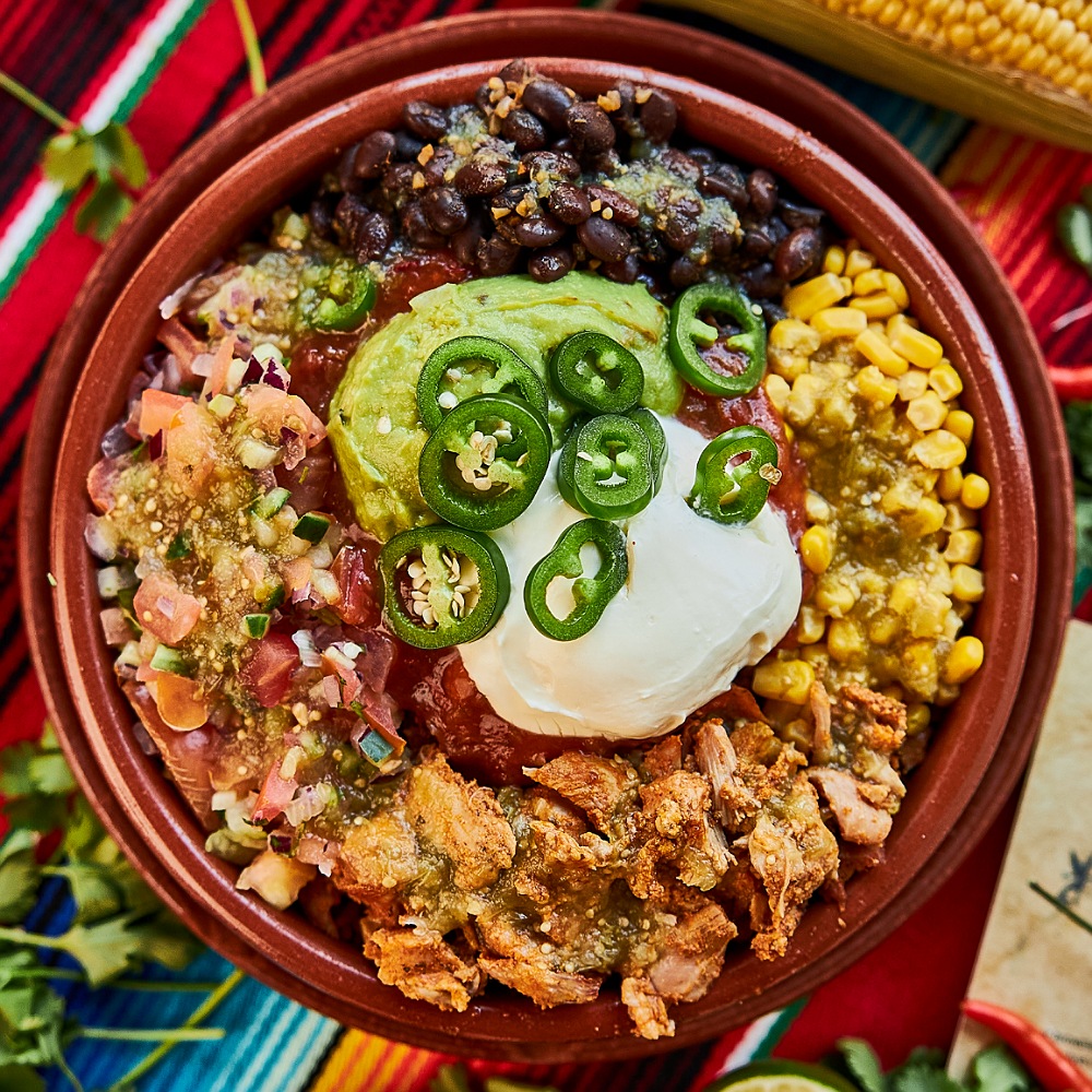 Mexicaanse rijst, proteĂ¯ne naar keuze, mais en pico de gallo geserveerd met guacamole, sour cream, ...