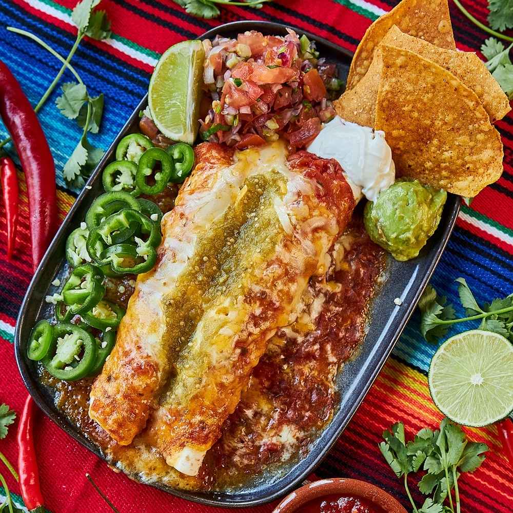 Gevulde tarwetortilla's met proteĂ¯ne naar keuze, gesmolten kaas, tomatillo en huisgemaakte salsa geserveerd met guacamole, ...