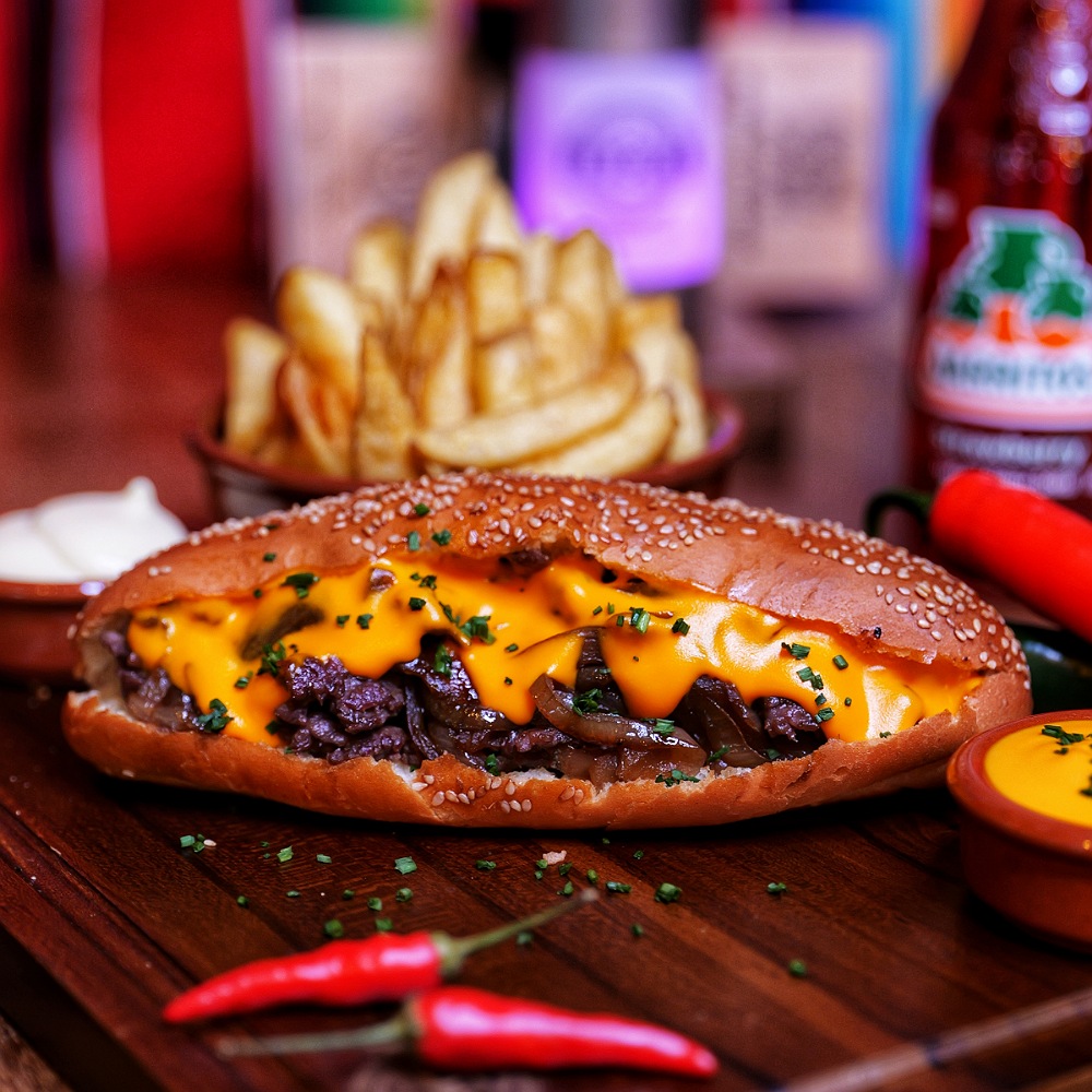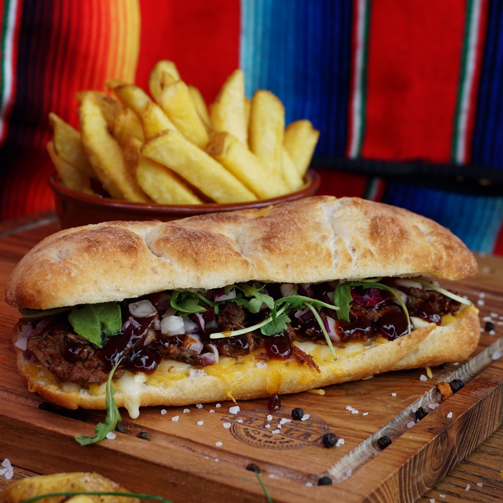 Oven baked bun, pulled beef, gesmolten kaas, sweet BBQ saus, rucola en rode ui € ...