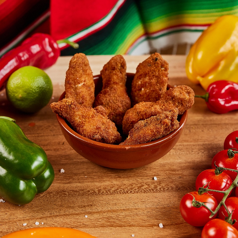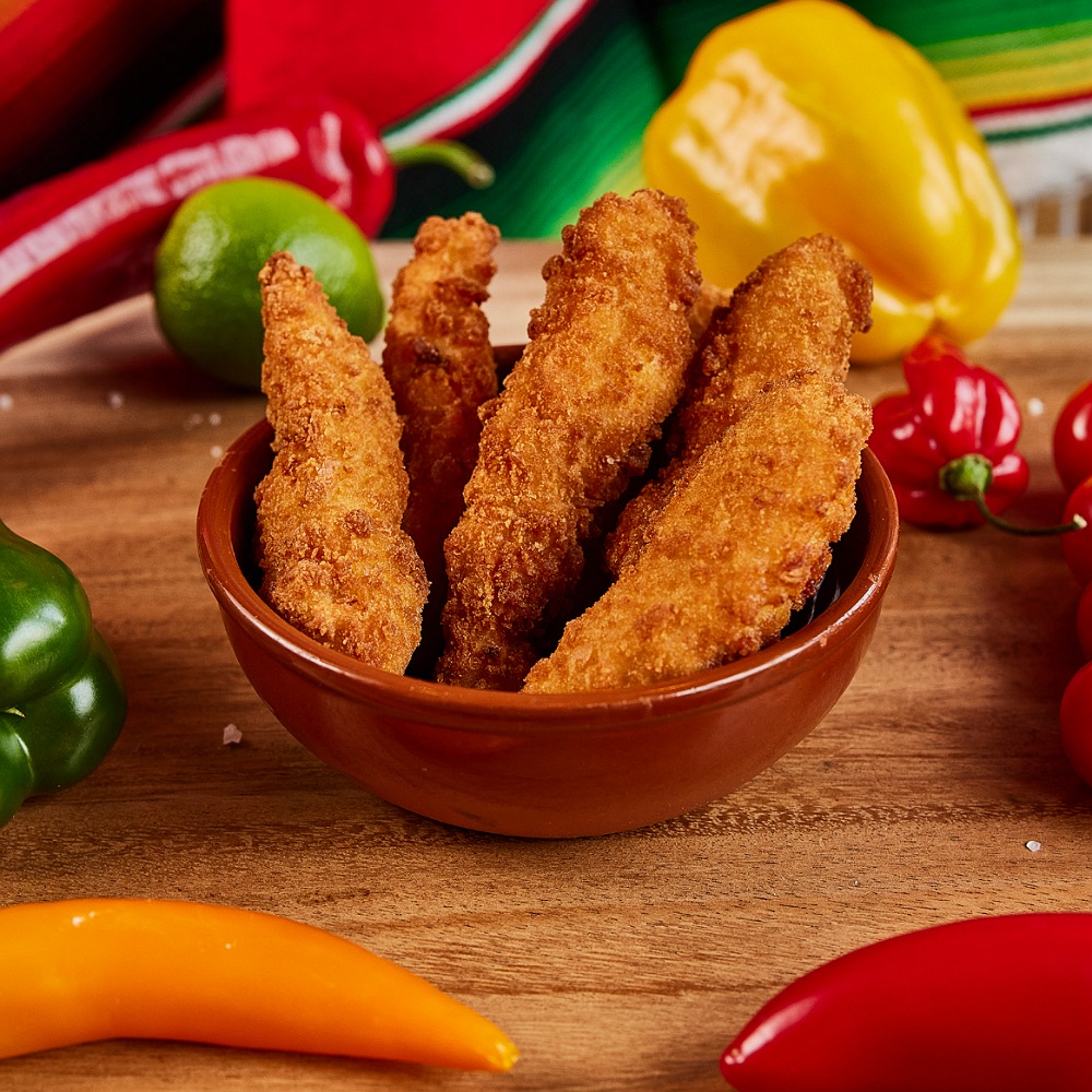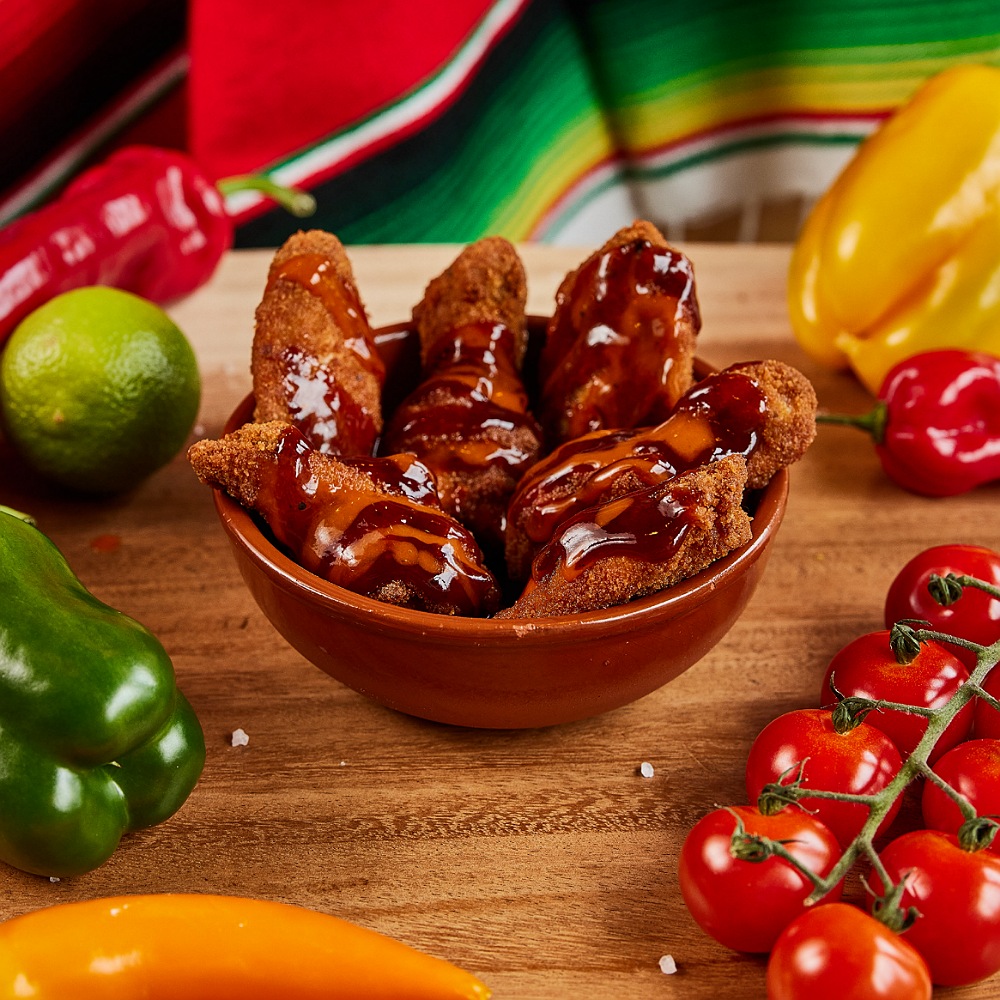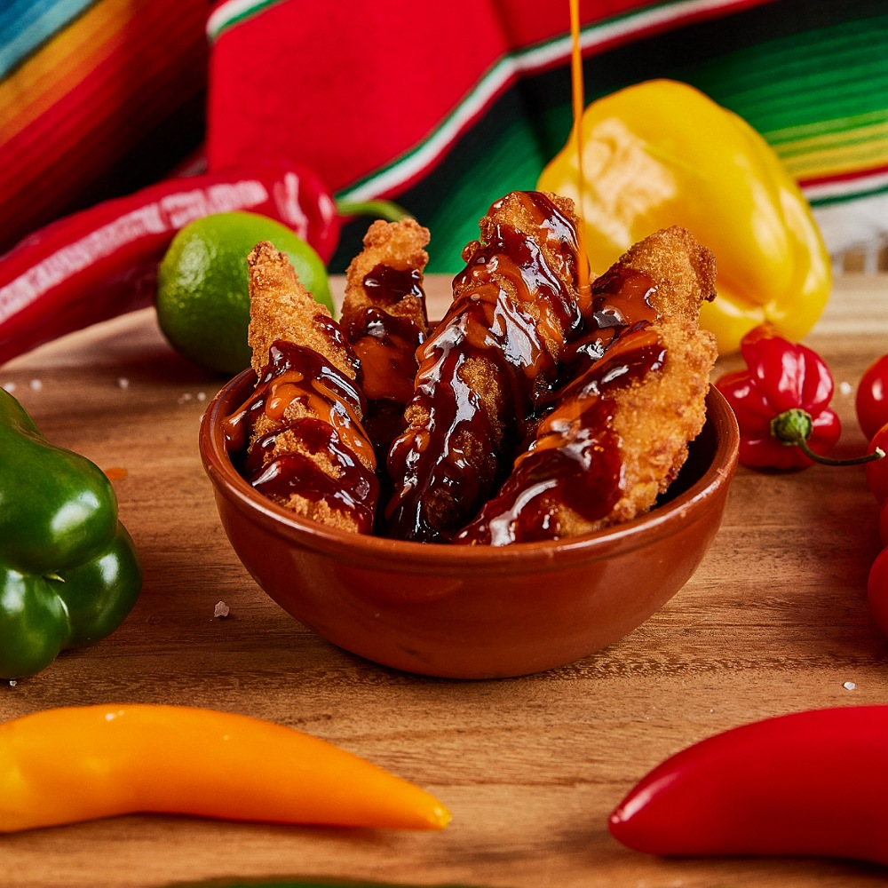 6 stuks, krokant gefrituurde kipfiletstrips geglazuurd met huisgemaakte saus van cayenne peper en smokey bbq.