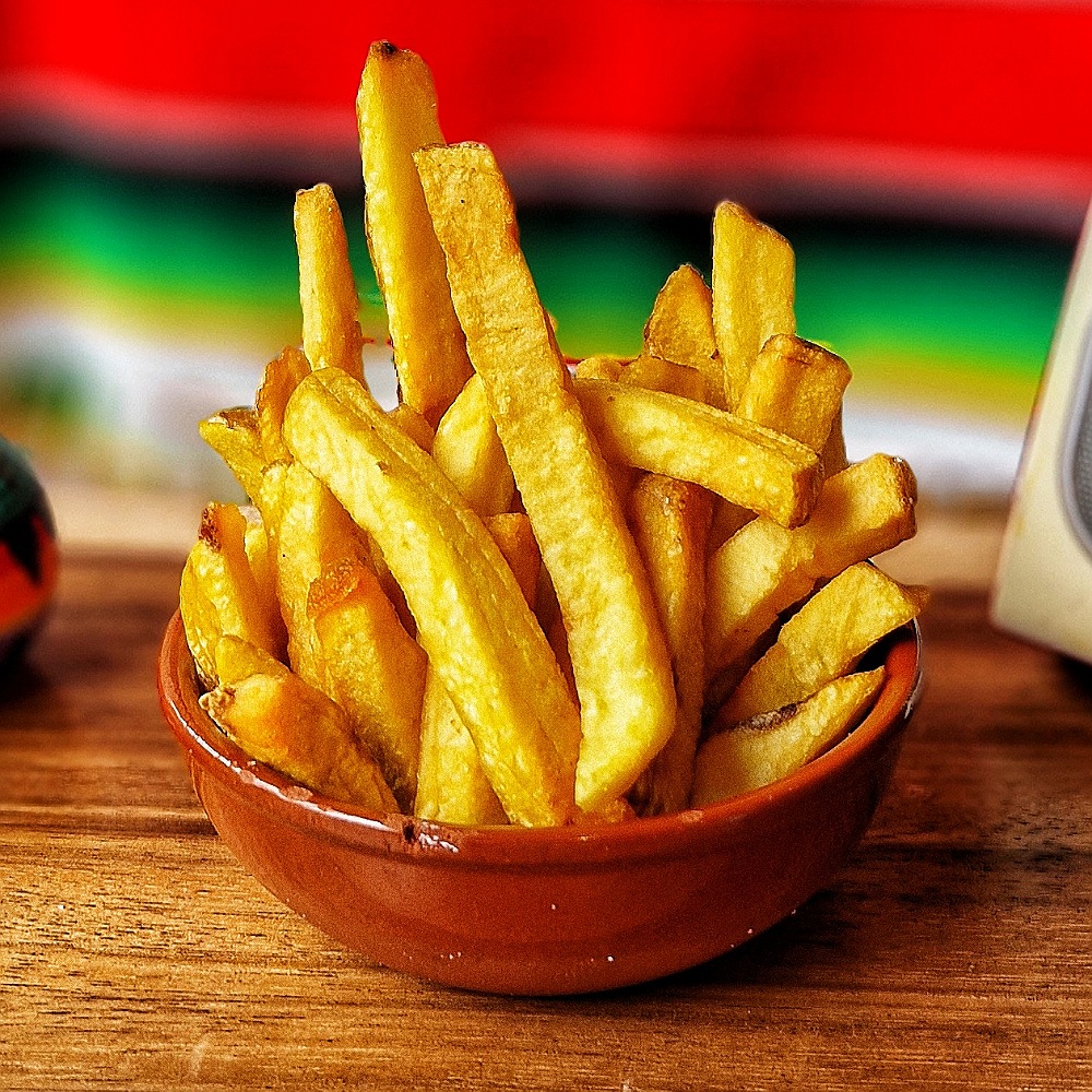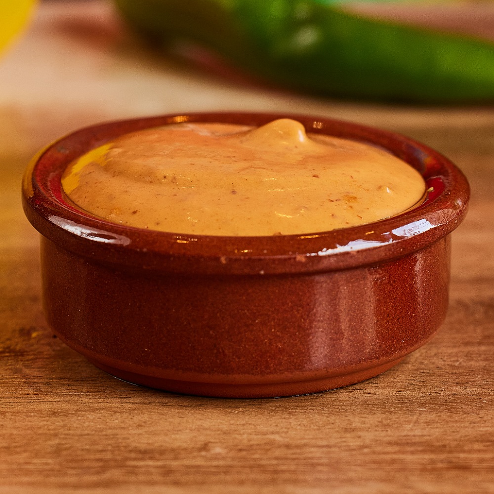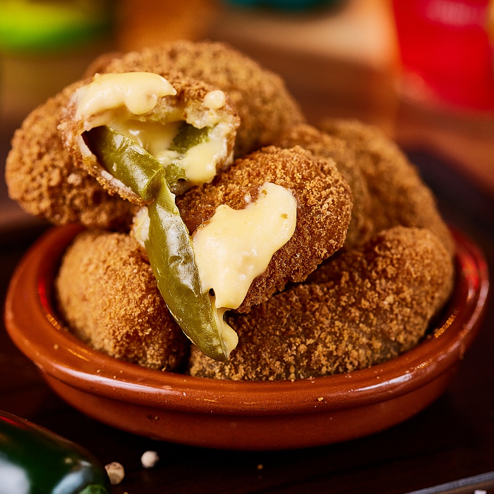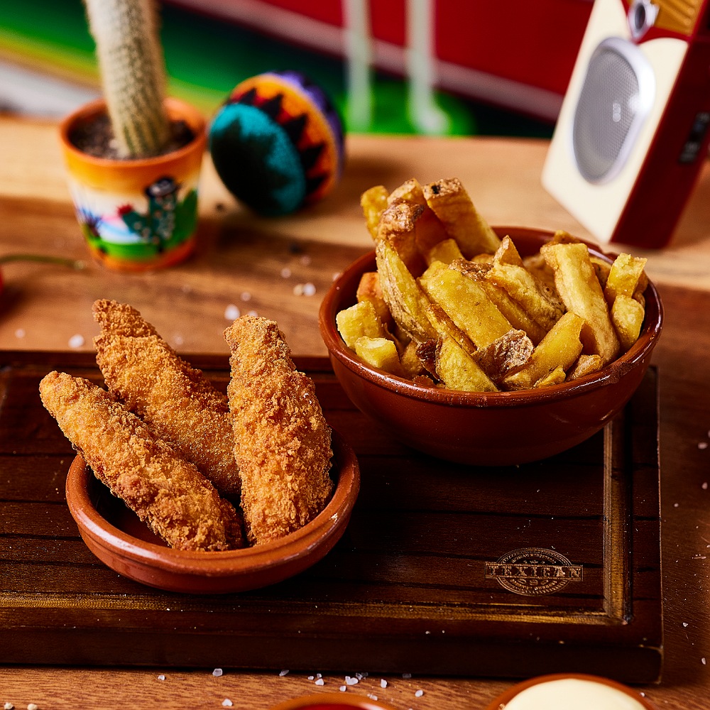 6 stuks, krokant gefrituurde kipfiletstrips geglazuurd met huisgemaakte saus van cayenne peper en smokey bbq.