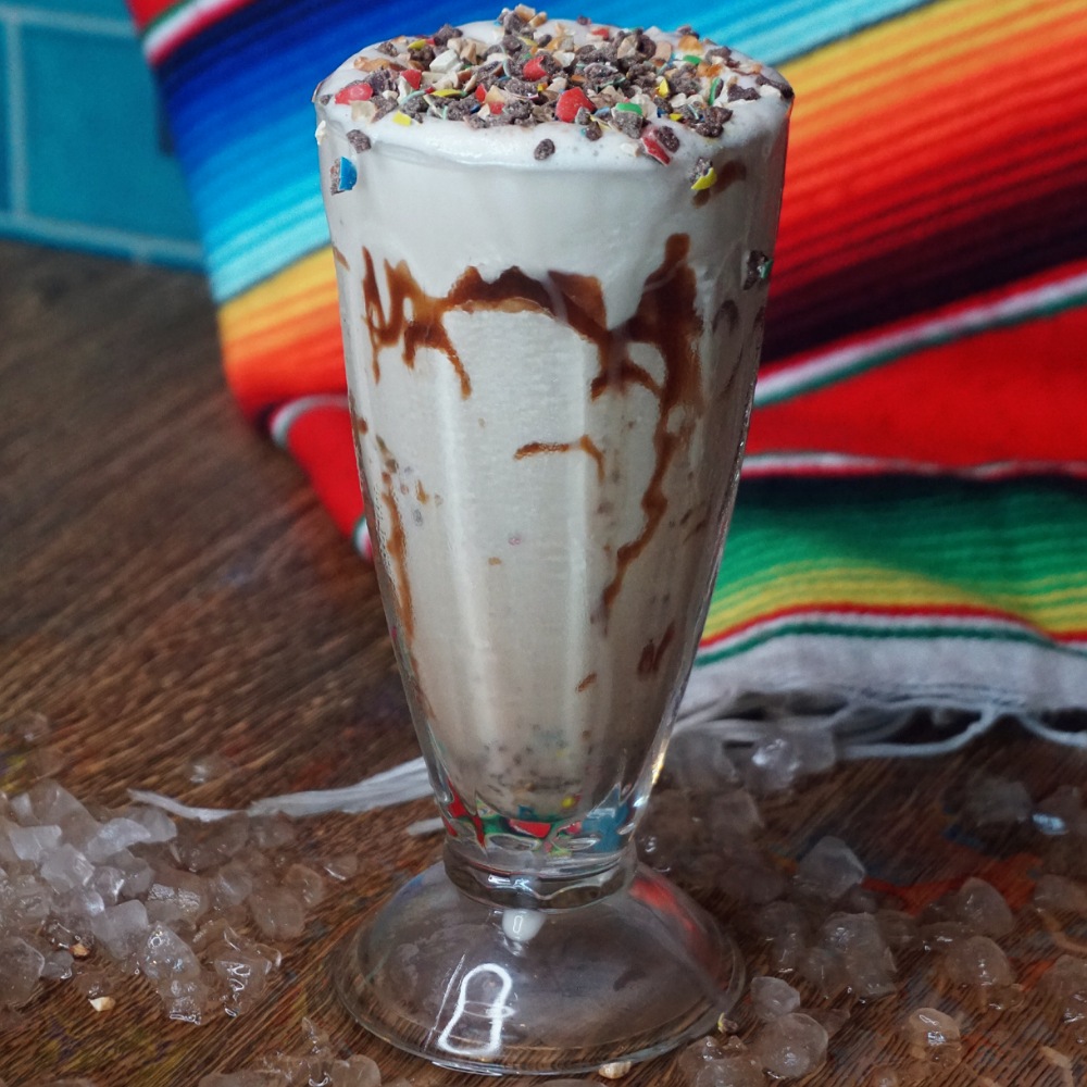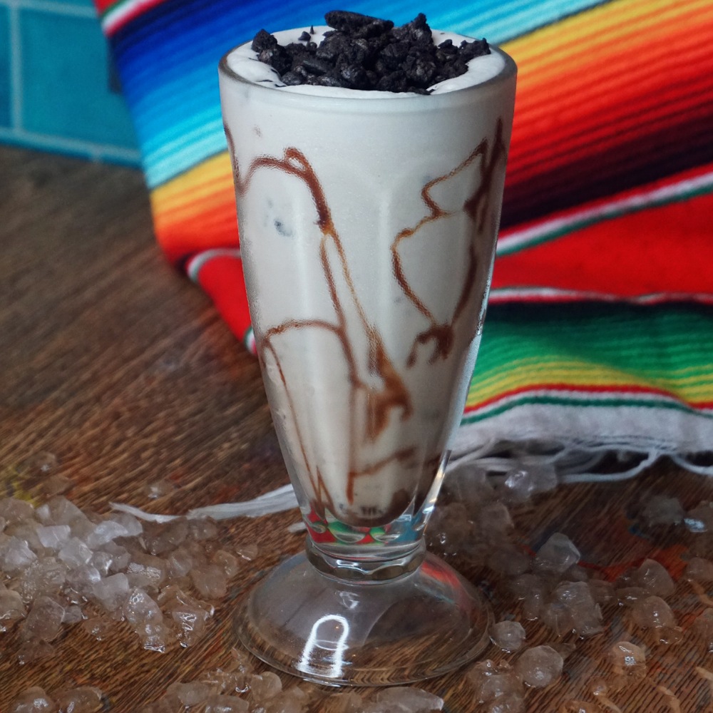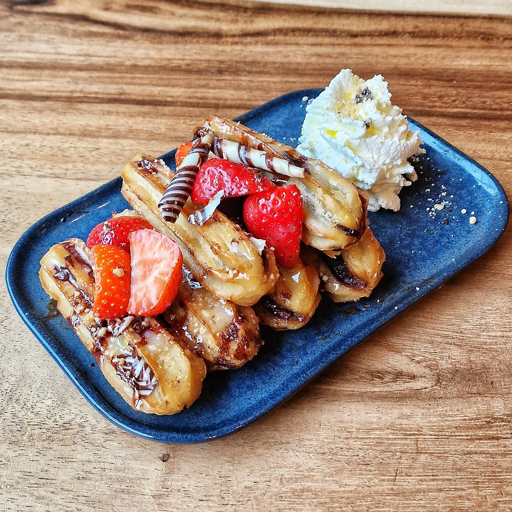 6 stuks chocolate filled churros, gegarneerd met 3 chocoladesauzen, cookie crumble, slagroom en aardbeien.