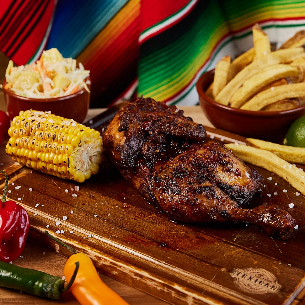 1/2 roasted chicken geglazuurd met een licht pikante kruidenolie en een heerlijke honing-mosterd dipsaus. Geserveerd ...