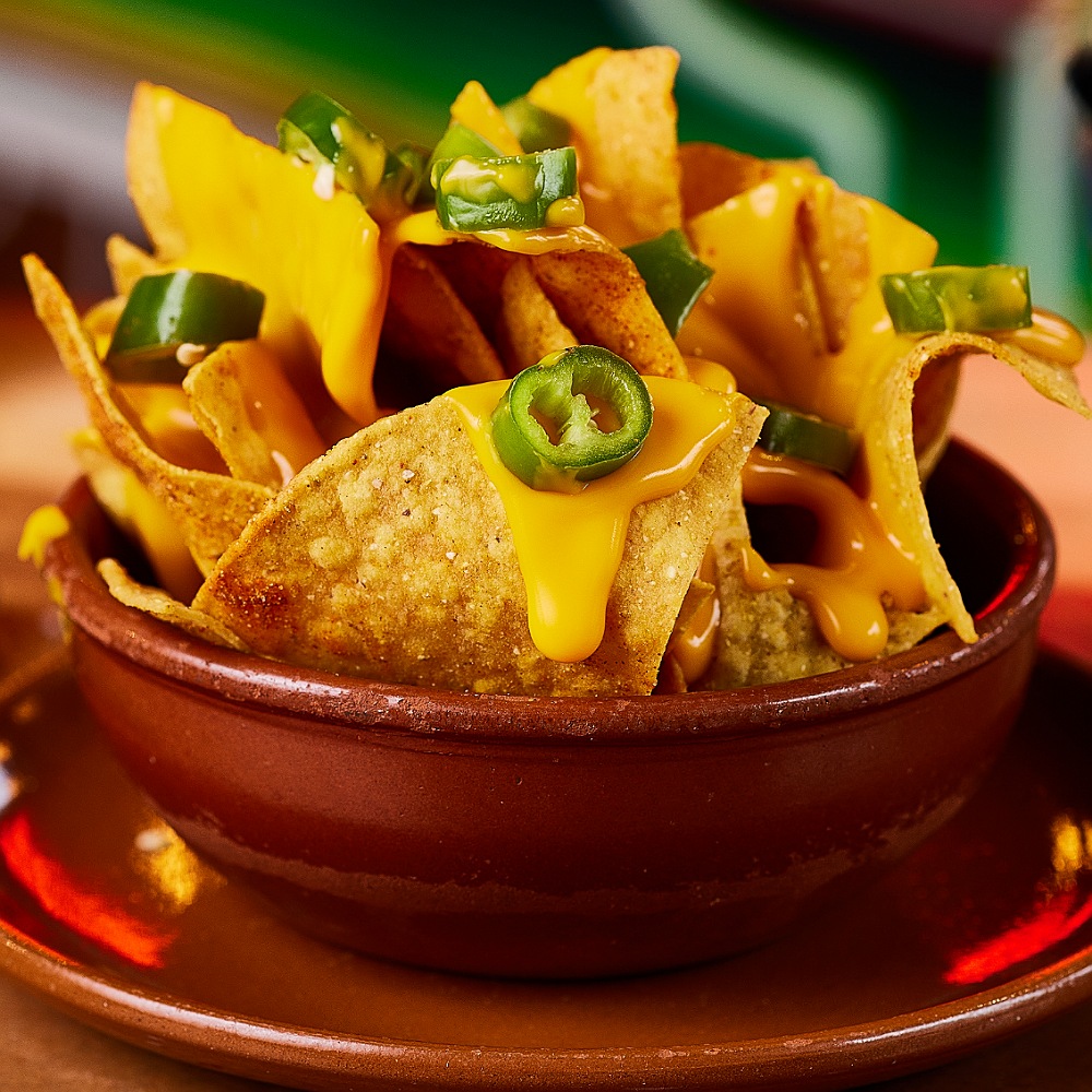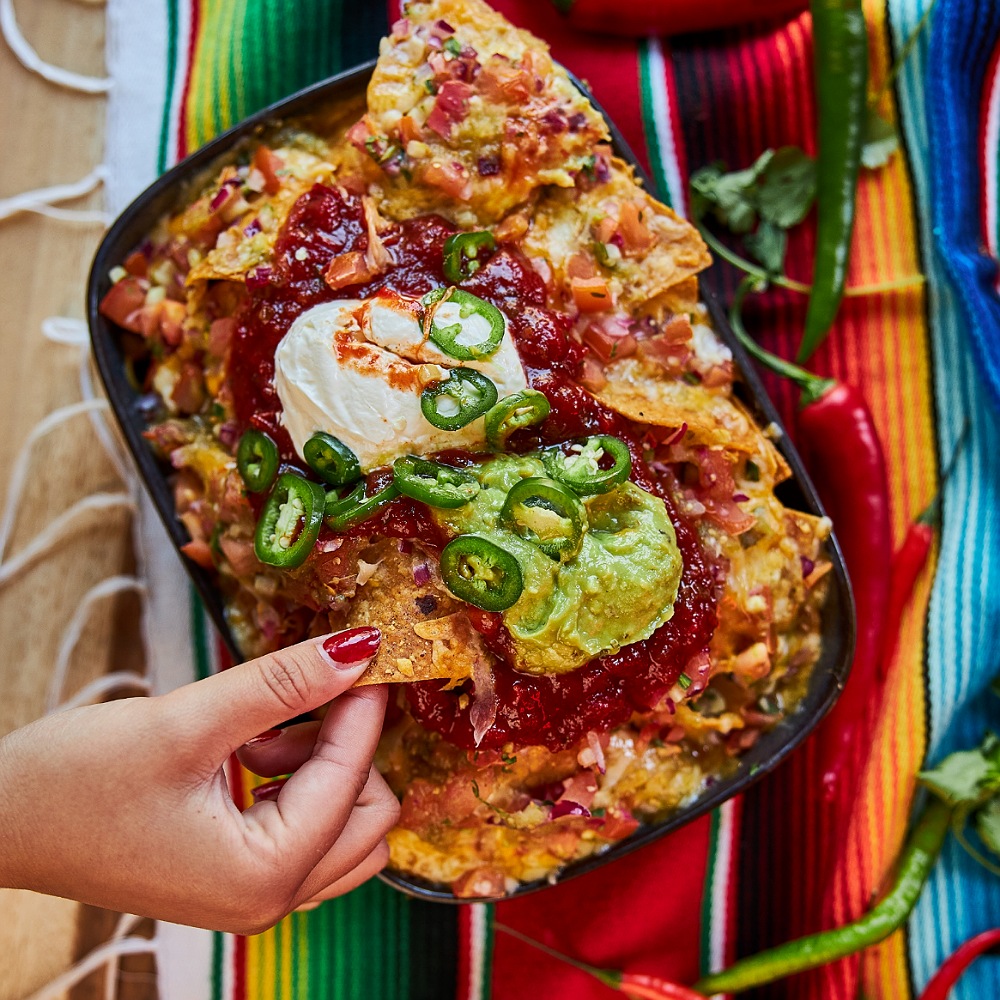 Huisgemaakte Mexicaans gekruide nacho's, pico de gallo, tomatillo, gesmolten kaas, jalapeno chutney, guacamole, sour cream ...