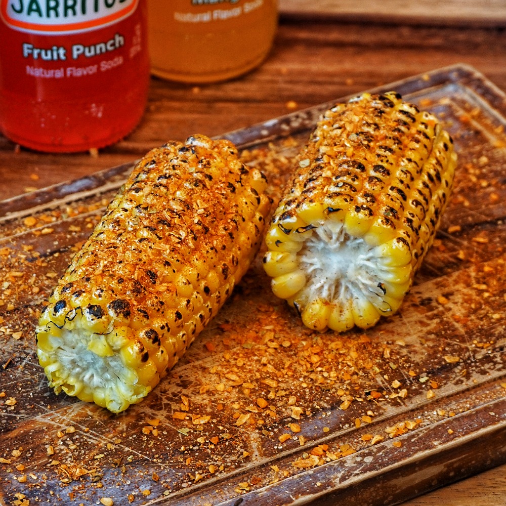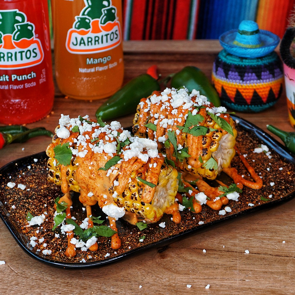Twee halve gegrilde maiskolfjes met chipotle mayonaise, Mexicaanse kruiden, fetakaas en koriander