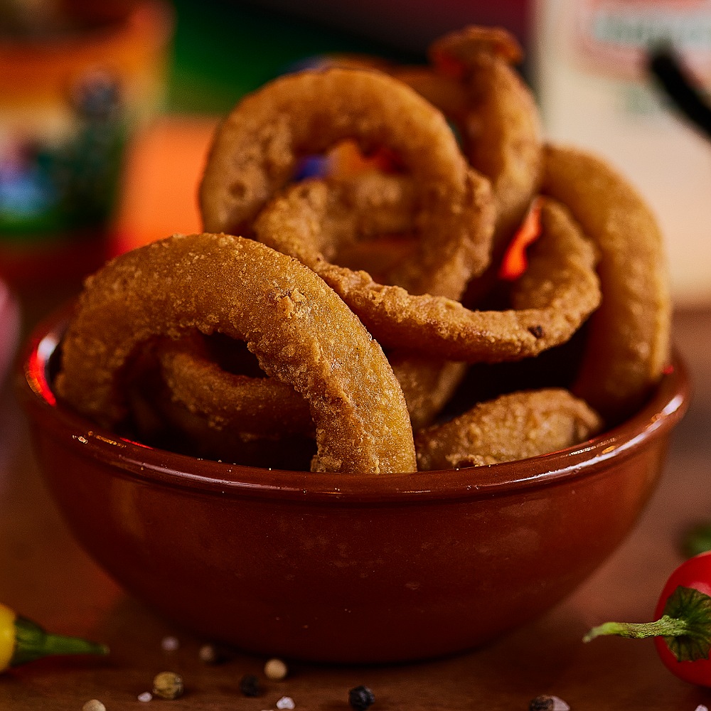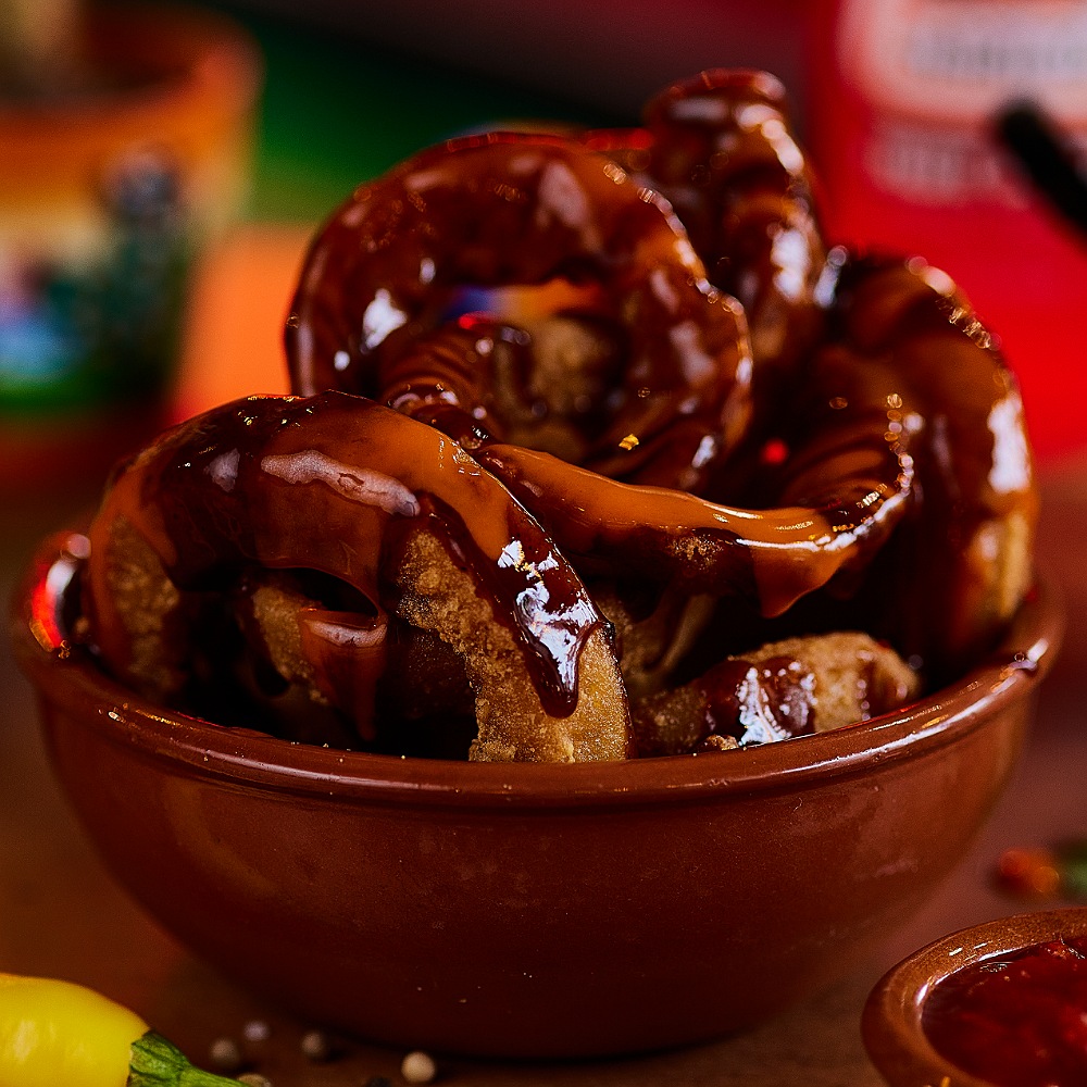 13 stuks, krokant gefrituurde onion rings geglazuurd met huisgemaakte saus van cayenne peper en smokey ...