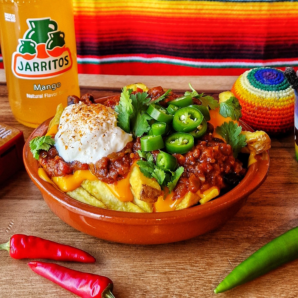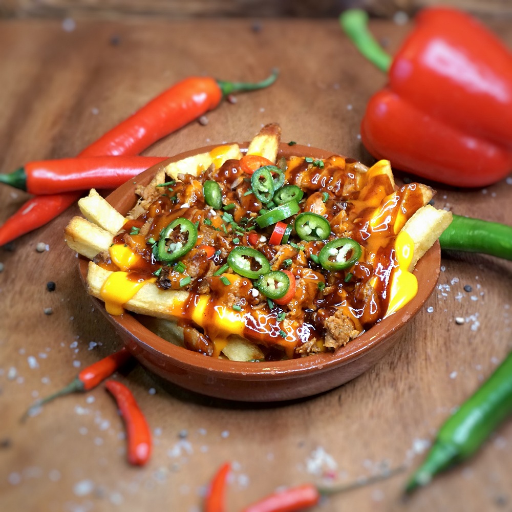 Huisgemaakte frites met schil, cheddar saus, plant-based chili sin carne, jalapeños, koriander en sour cream