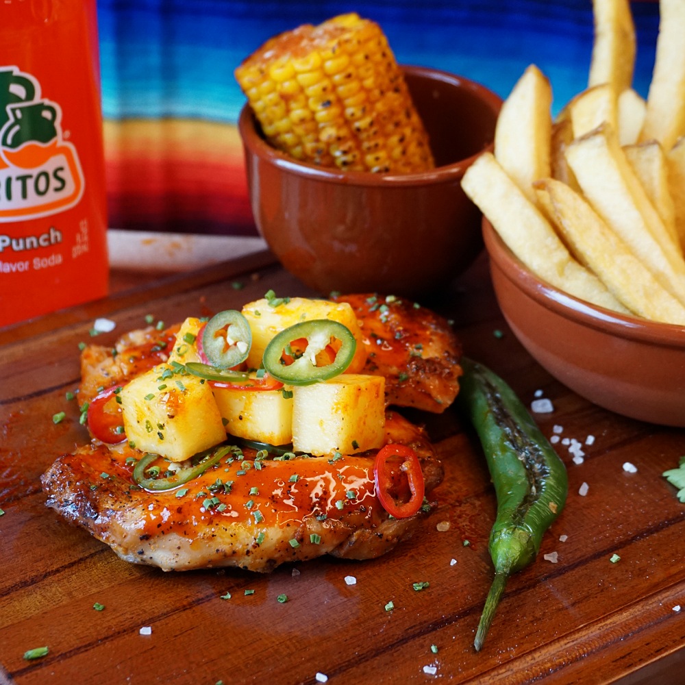 +- 250 gram kippendijfilet met zoete ananas en een licht pikante kruidenolie geserveerd met friet ...